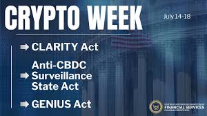 한편, 미국 의회에서는 7월 셋째 주를 ‘Crypto Week’로 지정하고 암호화폐 관련 입법을 본격적으로 추진 중입니다. 대표적인 법안은 GENIUS Act(스테이블코인 프레임워크), CLARITY Act(자산 분류 법안), Anti-CBDC Act(디지털 달러 반대 법안) 등입니다.